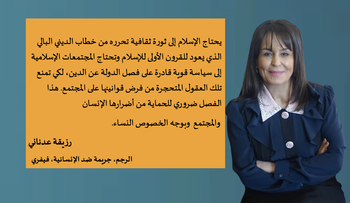 يحتاج الإسلام إلى ثورة ثقافية تحرره من خطاب الديني البالي الذي يعود للقرون الأولى و تحتاج المجتمعات الإسلامية إلى سياسة قوية قادرة على فصل الدولة عن الدين، لكي تمنع تلك العقول المتحجرة من فرض قوانينها على المجتمع. هذا الفصل .ضروري للحماية من أضرارها الإنسان والمجتمع وبوجه الخصوص النساء