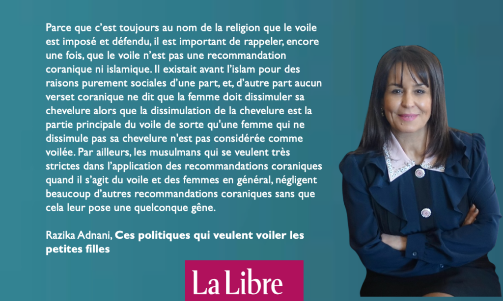 En Occident et précisément en France et en Belgique, des politiques, femmes et hommes, défendent de plus en plus le voilement non seulement des femmes, mais aussi des petites filles. Ce fût le cas d’Éric Dupont-Moretti en 2021qui était alors ministre de la Justice de la République française, du député bruxellois, Fouad Ahidar, de l’ancien ministre de la République française Dominique De Villepin. Ces derniers jours, c’était aux membres du parti politique La France insoumise de le défendre après que des petites filles voilées ont participé à des débats à l’Assemblée nationale. Tous ces politiques se sont retranchés, pour défendre cette pratique archaïque, derrière l’argument de la liberté de pratiquer sa religion. Pour eux, les musulmanes ont le droit de porter le voile tout comme les juifs portent la kippa et les chrétiens la croix.