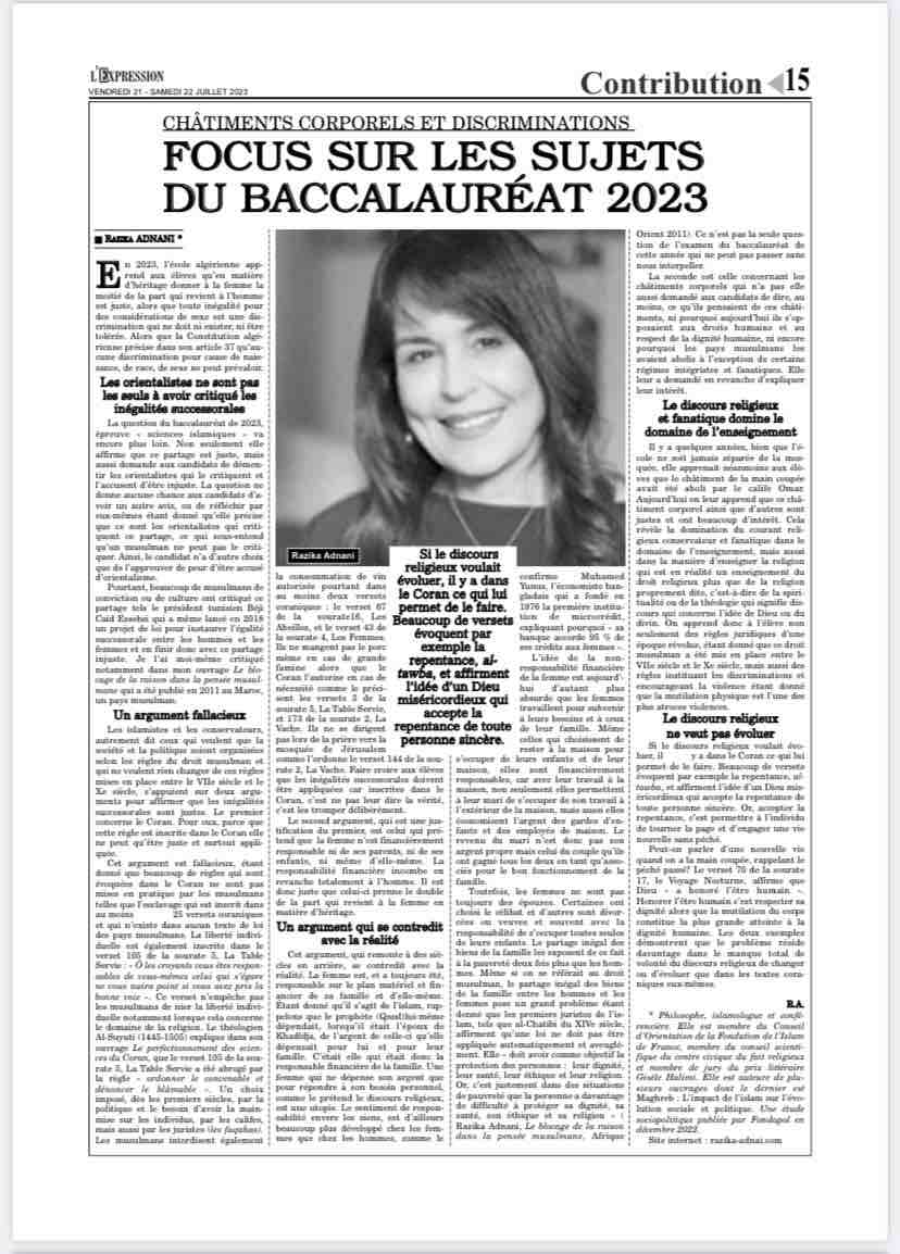 La question du baccalauréat de 2023, épreuve « sciences islamiques » va encore plus loin. Non seulement elle affirme que ce partage est juste mais aussi demande aux candidats de démentir les orientalistes qui le critiquent et l’accusent d’être injuste. La question ne donne aucune chance aux candidats d’avoir un autre avis, ou de réfléchir par eux-mêmes étant donné qu’elle précise que ce sont les orientalistes qui critiquent ce partage, ce qui sous-entend qu’un musulman ne peut pas le critiquer. Ainsi, le candidat n’a d’autre choix que de l’approuver de peur d’être accusé d’orientalisme.