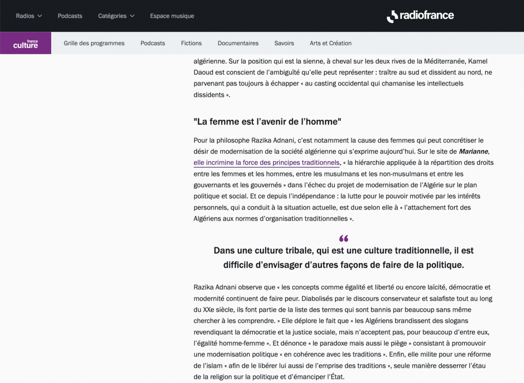 Pour la philosophe Razika Adnani, c’est notamment la cause des femmes qui peut concrétiser le désir de modernisation de la société algérienne qui s’exprime aujourd’hui. Sur le site de Marianne, elle incrimine la force des principes traditionnels, « la hiérarchie appliquée à la répartition des droits entre les femmes et les hommes, entre les musulmans et les non-musulmans et entre les gouvernants et les gouvernés » dans l’échec du projet de modernisation de l’Algérie sur le plan politique et social. Et ce depuis l’indépendance : la lutte pour le pouvoir motivée par les intérêts personnels, qui a conduit à la situation actuelle, est due selon elle à « l’attachement fort des Algériens aux normes d’organisation traditionnelles ».
