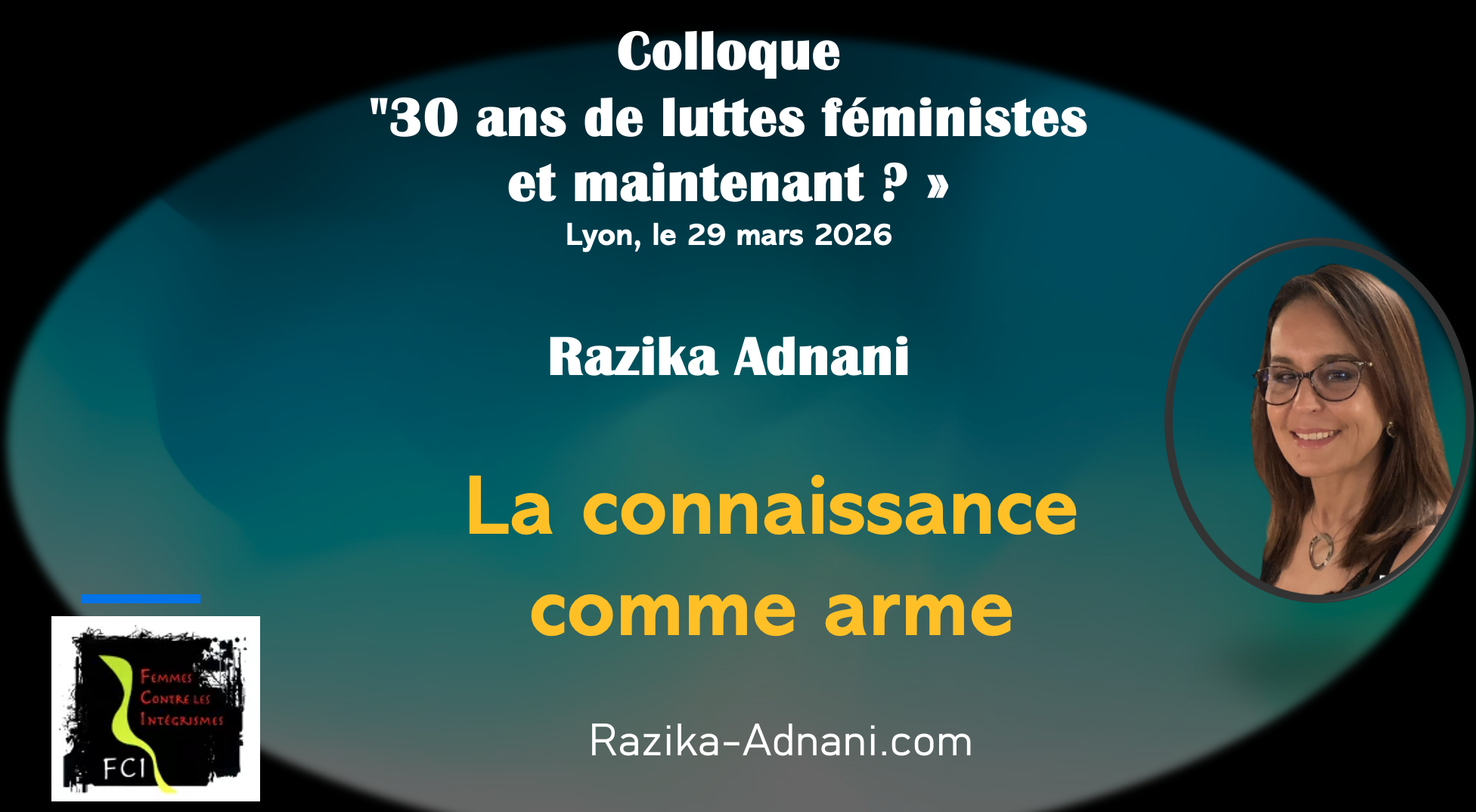 Razika Adnani participe le 29 mars 2026 au colloque « 30 ans de luttes féministes et maintenant ? » organisé par l’association Les femmes contre les intégristes. Elle interviendra sur le thème : La connaissance comme arme. « La connaissance comme arme » est un titre d’un des chapitres de son ouvrage Sortir de l’islamisme.