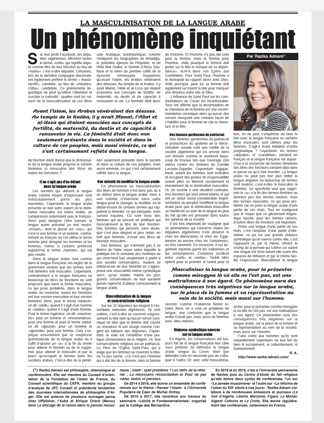 En Algérie, les conservateurs ont toujours fait de la langue française leur cible sous prétexte de défendre la langue arabe, langue du Coran. Bien que défendre l’une ne nécessite pas de s’attaquer à l’autre. Or, avec cette masculinisation, on ne peut s’empêcher de faire le lien avec la langue française où certains titres masculins sont utilisés pour les femmes. S’agit-il d’une imitation d’ordre pragmatique ?  Cependant, les termes « députée » et « candidate » existent en français et la langue française est aujourd’hui à la recherche de formes féminines des titres des fonctions existant déjà dans le passé ou qu’il faut inventer. La langue arabe ne peut pas non plus imiter la langue anglaise où beaucoup de termes sont neutres, c’est-à-dire ni masculins ni féminins. Sa spécificité veut que supprimer le « a » à la fin des termes féminins ne donnera pas des termes neutres, mais des termes masculins, ce qui pose problème car on prive la langue arabe d’une partie de ses mots. Tout en soulignant que le risque que ce glissement linguistique touche, pour les mêmes raisons, d’autres titres de fonctions est important.