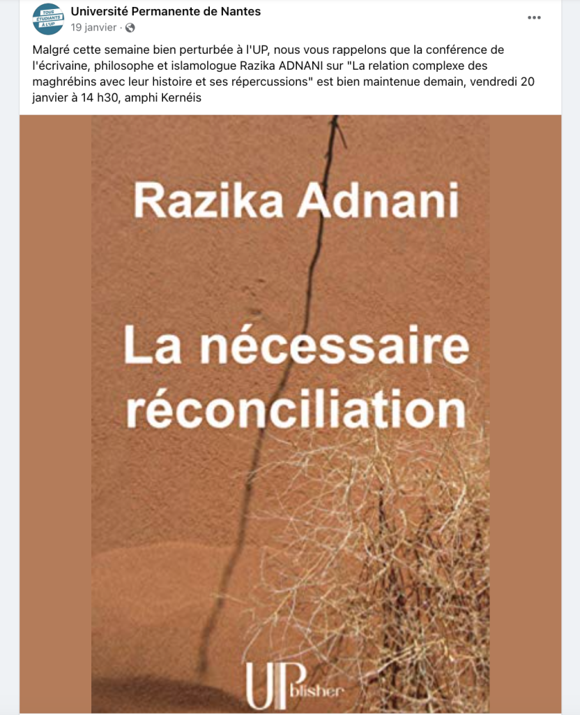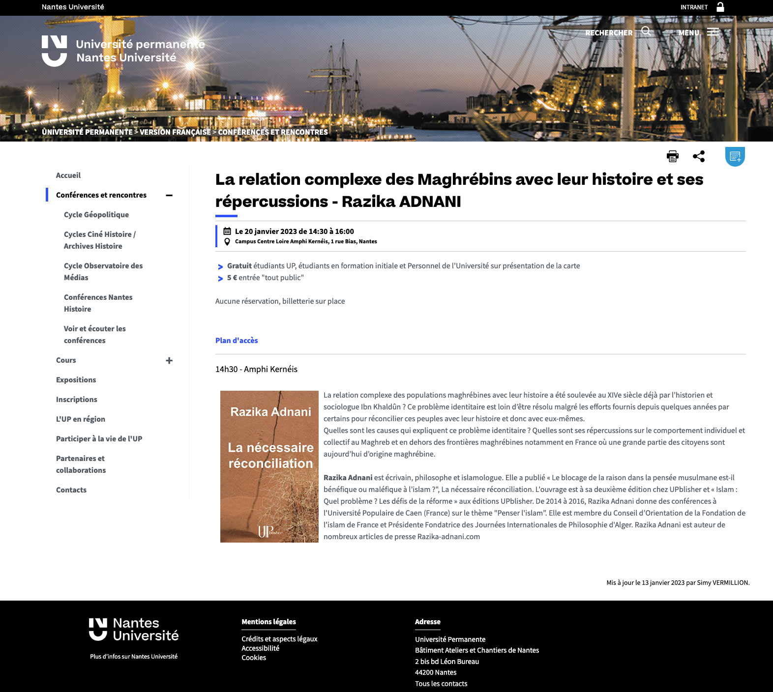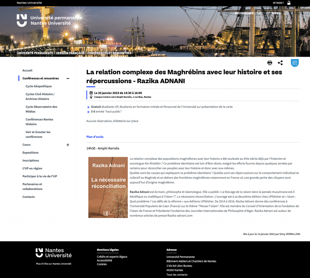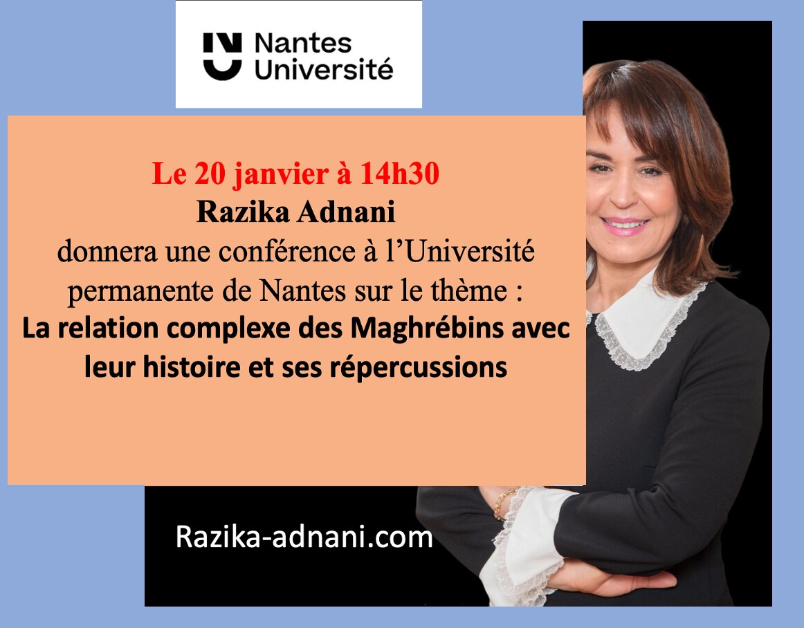 20 janvier 2023 à 14h30, Razika Adnani donnera une conférence à l’Université permanente de Nantes le sur le thème : La relation complexe des Maghrébins avec leur histoire et ses répercussions