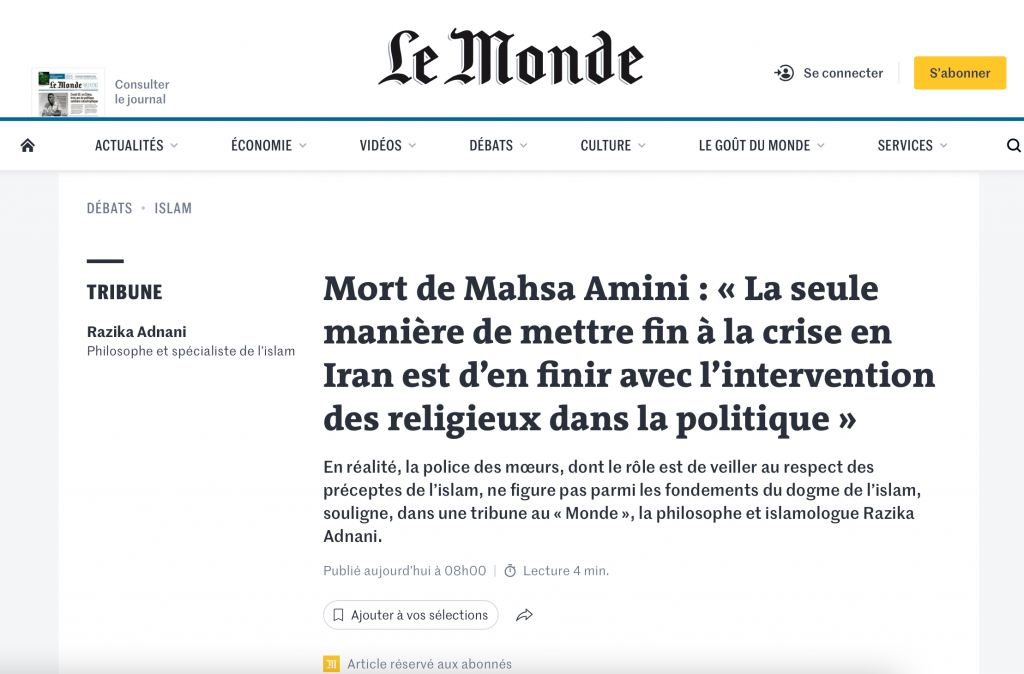 La mort de Mahsa Amini » La seule manière de mettre fin à la crise en Iran est d’en finir avec l’intervention des religieux dans la politique »