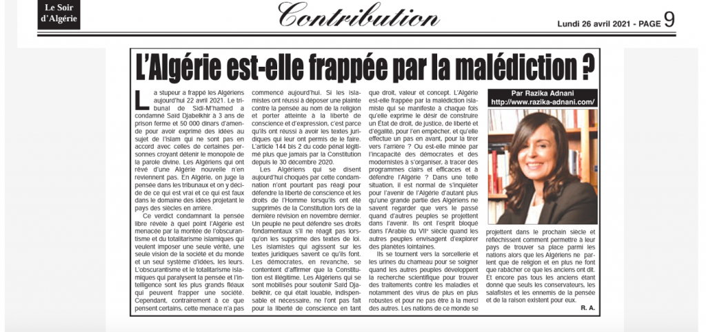 Ce verdict condamnant la pensée libre révèle à quel point l’Algérie est menacée par la montée de l’obscurantisme et du totalitarisme islamiques qui veulent imposer une seule vérité, une seule vision de la société et du monde et un seul système d’idées, les leurs. L’obscurantisme et le totalitarisme islamiques qui paralysent la pensée et l’intelligence sont les plus grands fléaux qui peuvent frapper une société. Cependant, contrairement à ce que pensent certains, cette menace n’a pas commencé aujourd’hui. Si les islamistes ont réussi à déposer une plainte contre la pensée au nom de la religion et porter atteinte à la liberté de conscience et d’expression, c’est parce qu’ils ont réussi à avoir les textes juridiques qui leur ont permis de le faire. L’article 144 bis 2 du Code pénal légitimé plus que jamais par la Constitution depuis le 30 décembre 2020.
