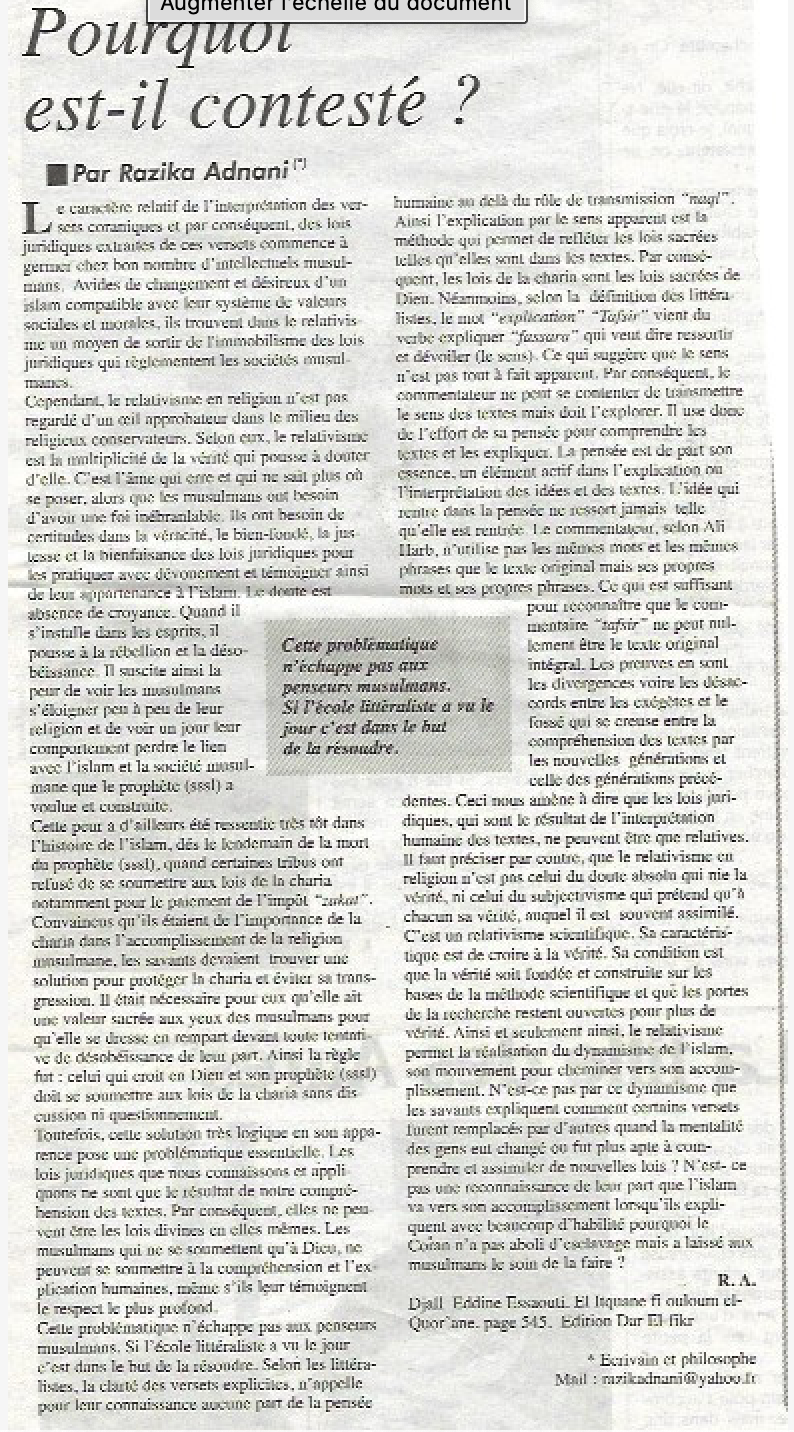 En conclusion, les musulmans ne devraient-ils pas être, dans ce cas, l’exemple de la tolérance et de l’écoute de l’autre? Pourquoi l’autre n’aurait-il pas le droit d’avoir une autre manière d’aborder les textes, de les comprendre ? Pourquoi considérer les connaissances des textes comme des vérités absolues et traiter l’autre de mécréant car il ou elle voit et comprend autre chose que ce que voient et comprend les autres musulmans ? Pourquoi refuser le dialogue et la discussion ?