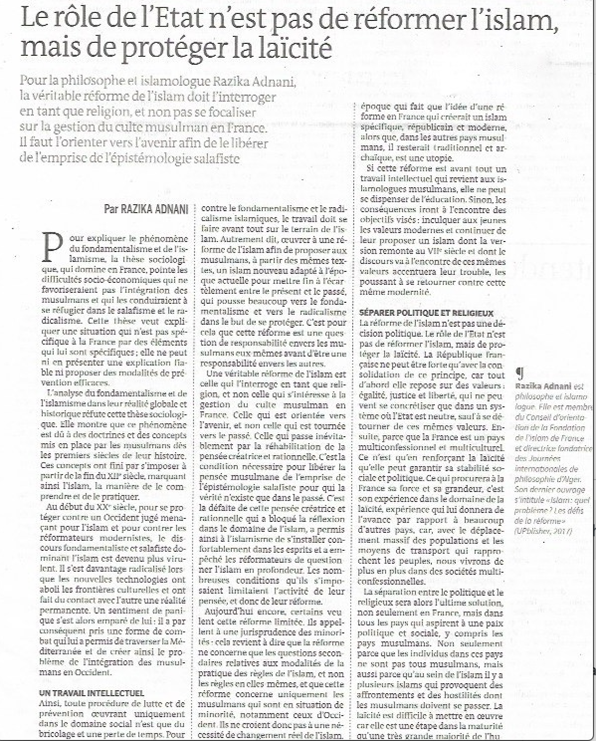 La réforme de l’islam n’est pas une décision politique. Le rôle de l’État n’est pas de réformer l’islam, mais de protéger la laïcité. La République Française ne peut être forte qu’avec la consolidation de ce principe, car tout d’abord elle repose sur des valeurs : égalité, justice et liberté qui ne peuvent se concrétiser que dans un système où l’État est neutre sauf à se détourner de ces mêmes valeurs. Ensuite, parce que la France est un pays multiconfessionnel et multiculturel, ce n’est qu’en renforçant la laïcité qu’elle peut garantir sa stabilité sociale et politique. Ce qui procurera à la France sa force et sa grandeur, c’est son expérience dans le domaine de la laïcité, expérience qui lui donnera de l’avance par rapport à beaucoup d’autres autres pays, car avec le déplacement massif des populations et les moyens de transports qui rapprochent les peuples, nous vivrons de plus en plus dans des sociétés multiconfessionnelles. La séparation entre le politique et le religieux sera alors l’ultime solution, non seulement en France, mais dans tous les pays qui aspirent à une paix politique et sociale y compris les pays musulmans. Les individus qui appartiennent à ces pays ne sont tous pas musulmans et au sein de l’islam il y a plusieurs islams qui provoquent des affrontements et des hostilités dont les musulmans doivent se passer. La laïcité est difficile à mettre en œuvre, car elle est une étape dans la maturité humaine qu’une très grande majorité d’hommes et de femmes n’a pas encore atteint.
