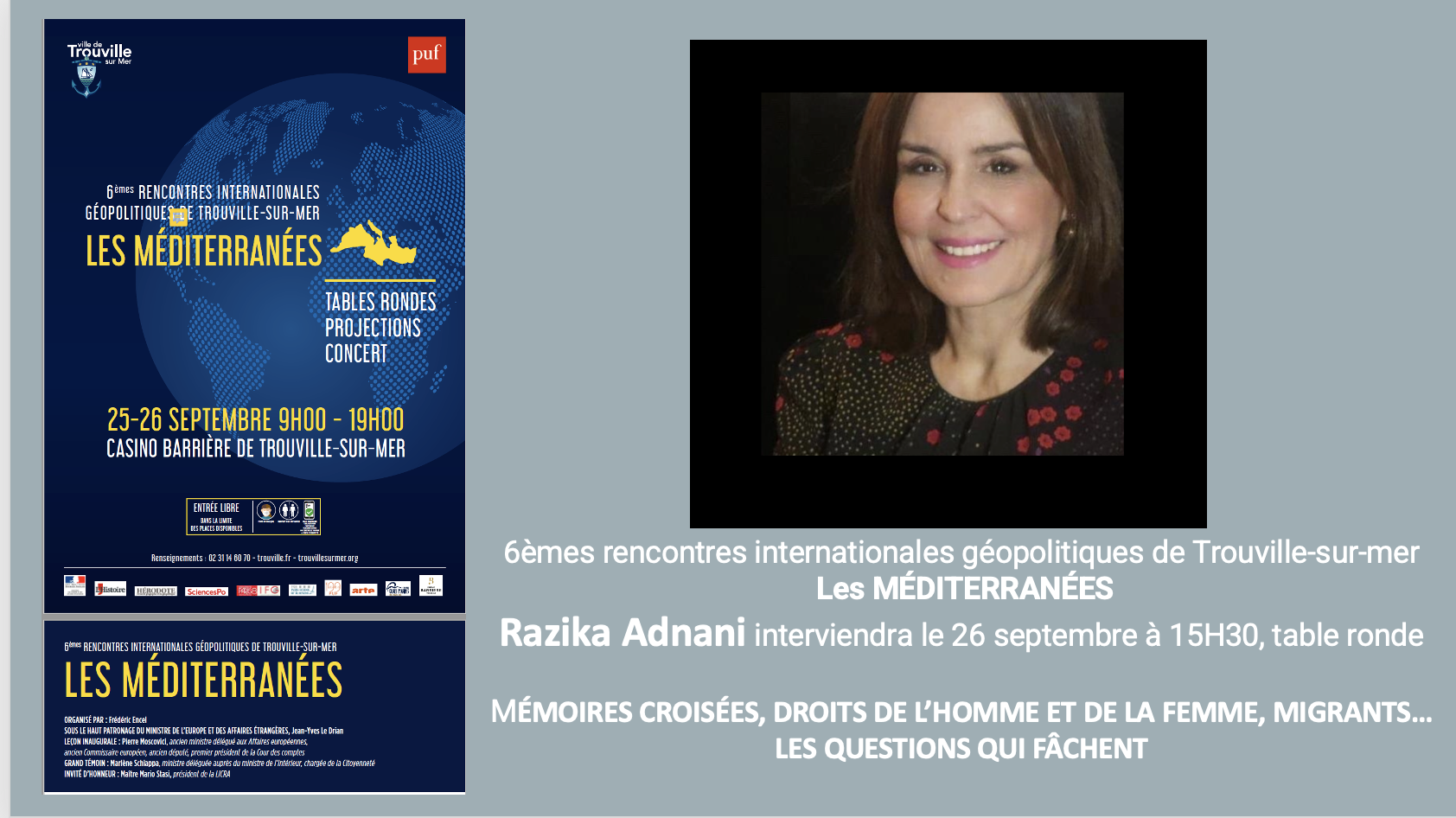 Razika Adnani participera aux 6èmes rencontres internationales géopolitiques de Trouville-sur-mer, organisées par Frédéric Encel, qui auront lieu les 25 et 26 septembre de 9h à 19h au casino Barrière de Trouville-sur-mer sous le thème de : Les MÉDITERRANÉES
