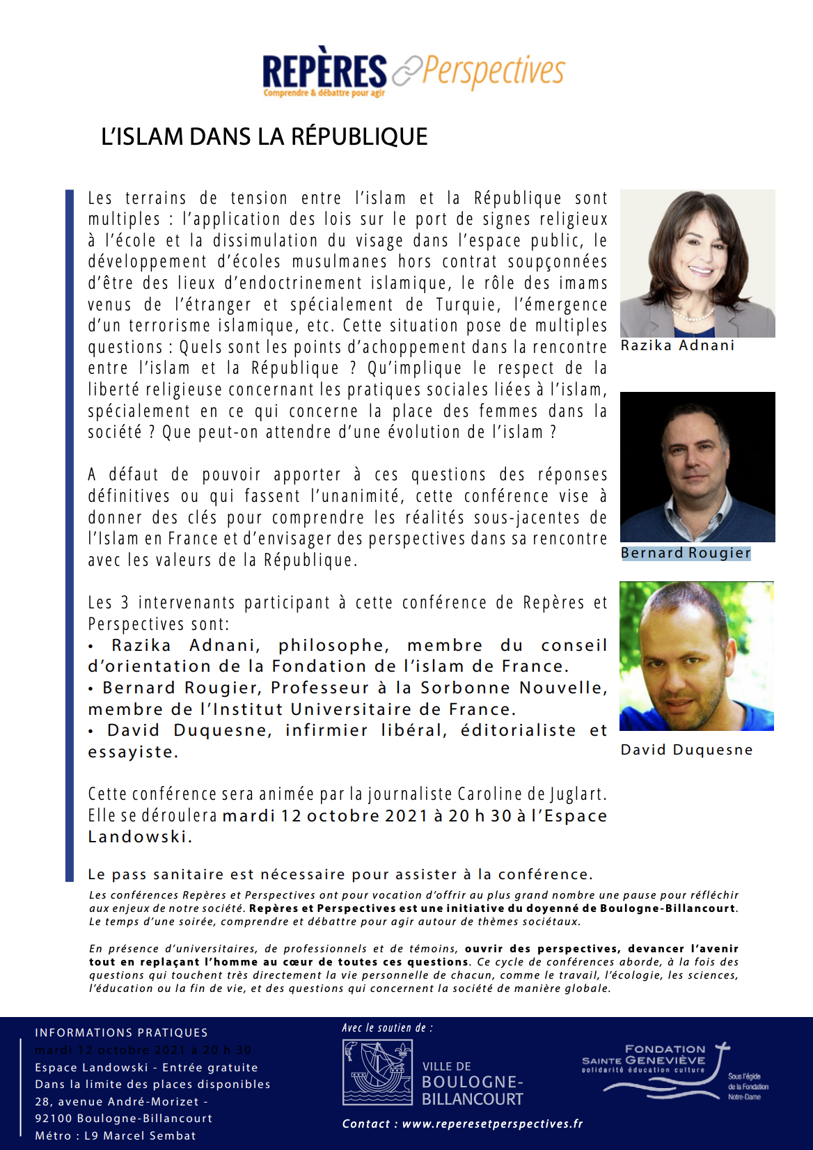 Le Mardi 12 octobre 2021 à 20h30, Razika Adnani sera l’invitée de Repères et Perspectives pour participer à une rencontre-débat sur le thème : L’ISLAM DANS LA RÉPUBLIQUE.
