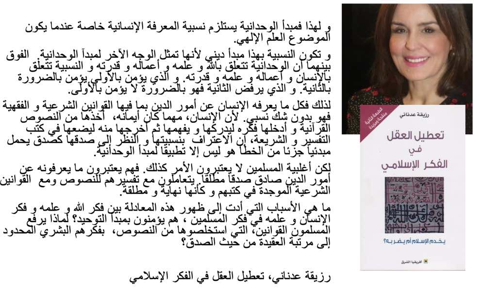 est un ouvrage de Razika Adnani qui aborde le problème du blocage de la raison, ou de la pensée rationnelle, dans la pensée musulmane et de ses conséquences sur la qualité de la pensée chez les musulmans et d’une manière particulière lorsqu’ils pensent l’islam. Amazon