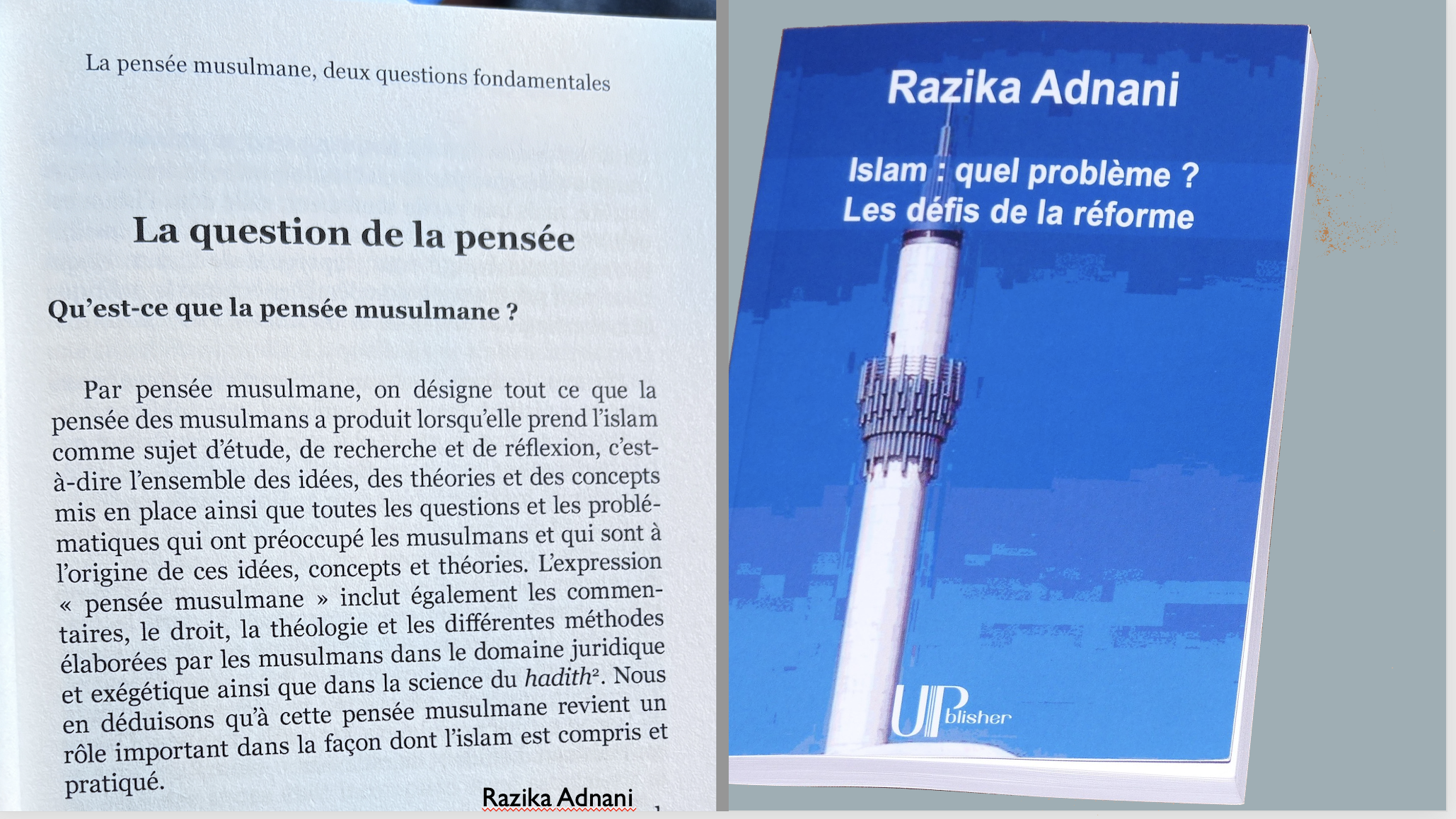 « Par pensée musulmane, on désigne tout ce que la pensée des musulmans a produit lorsqu’elle prend l’islam comme sujet d’étude, de recherche et de réflexion, c’est-à-dire l’ensemble des idées, des théories et des concepts mis en place ainsi que toutes les questions et les problématiques qui ont préoccupé les musulmans et qui sont à l’origine de ces idées, concepts et théories. L’expression « pensée musulmane » inclut également les commentaires, le droit, la théologie et les différentes méthodes élaborées par les musulmans dans le domaine juridique et exégétique ainsi que dans la science du hadith2. Nous en déduisons qu’à cette pensée musulmane revient un rôle important. » ( Razika Adnani, Islam : quel problème ? Les défis de la réforme, Upblisher, France 2017 et Afrique orient, Maroc, 2018.)