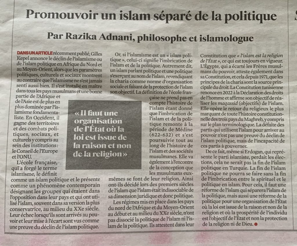 La fin de l’islam politique ne pourra se faire sans la fin de l’imbrication entre le spirituel et le politique en islam. Pour cela, il faut une réforme de l’islam qui séparera l’islam de la politique.