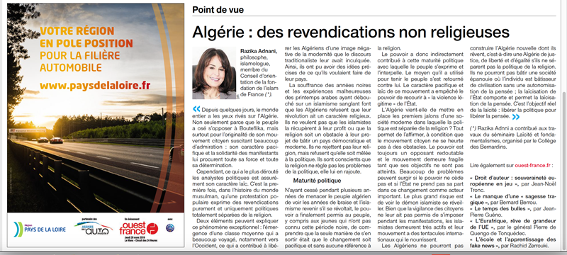 Les Algériens ne pourront pas construire l’Algérie nouvelle dont ils rêvent autrement dit une Algérie de justice, de liberté et d’égalité s’ils ne séparent pas la politique de la religion. Ils ne pourront pas bâtir une société épanouie où l’individu est bâtisseur de civilisation sans une autonomisation de la pensée ; la laïcisation de l’État comporte et permet la laïcisation de la pensée. C’est l’objectif réel de la laïcité : libérer la politique pour libérer la pensée. Razika Adnani