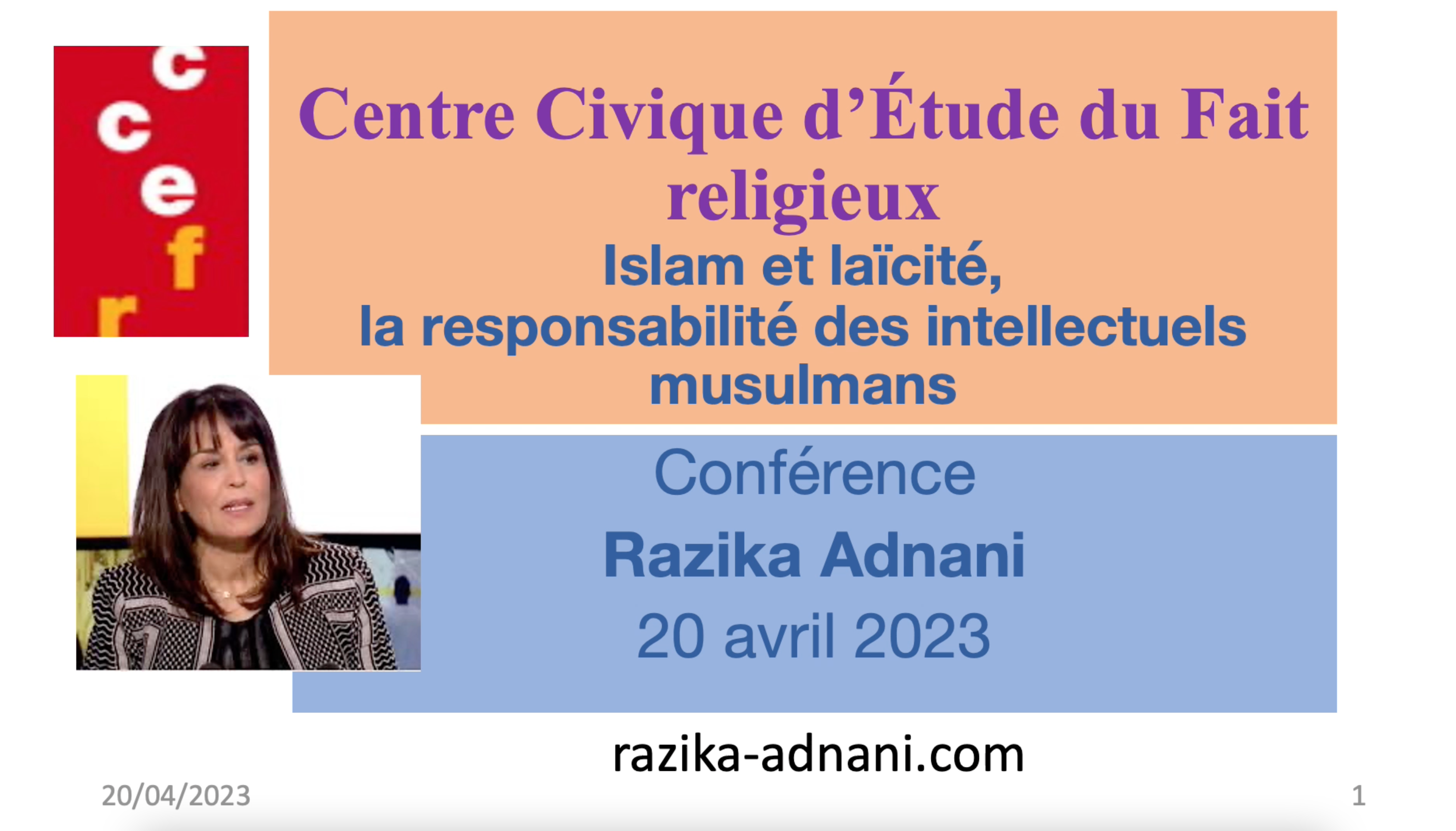 PowerPoint de la conférence de Razika Adnani donnée le 20 avril 2023 sur le thème : Islam et laïcité, la responsabilité des intellectuels musulmans.