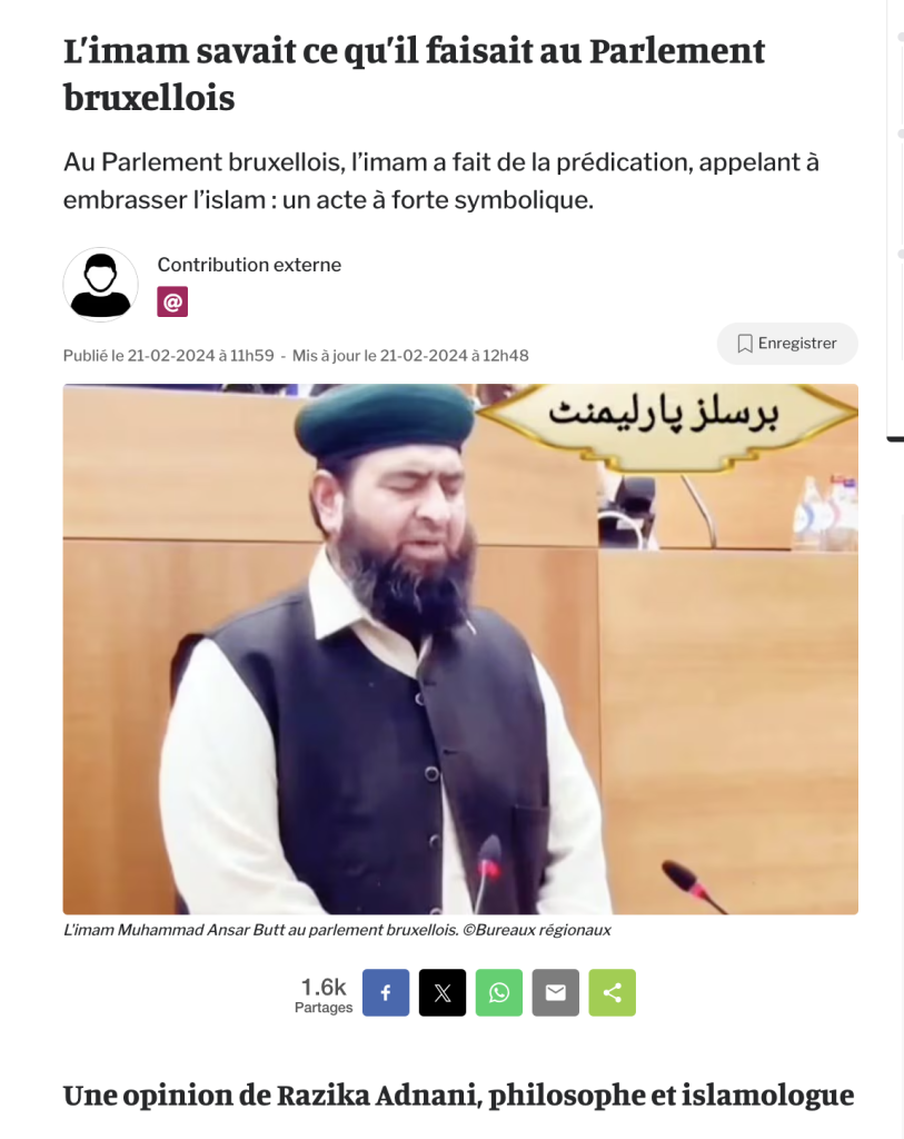Le 13 janvier dernier depuis la tribune du Parlement bruxellois un imam pakistanais, Muhammad Ansar Butt, a récité en psalmodiant pendant trois minutes et 30 secondes des versets du Coran, ce qui est un scandale politique d’une extrême gravité étant donné que cet imam ne s’est pas retrouvé au Parlement bruxellois par hasard. Il a été invité par des parlementaires. Il s’agit également d’un scandale politique car ceux qui l’ont invité ne pouvaient pas ignorer son activisme islamiste fondamentaliste, surtout qu’ils l’ont invité pour lui remettre une médaille de la bonne intégration. Des parlementaires bruxellois considèrent donc que son profil de fondamentaliste islamiste est un exemple de la bonne intégration des musulmans en Belgique. On marche sur la tête.