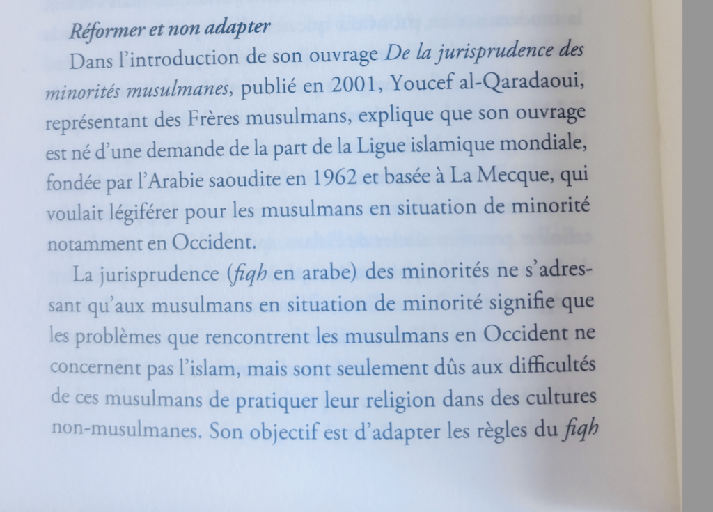 Dans l’introduction de son ouvrage De la jurisprudence des minorités musulmanes, publié en 2001, Youcef al-Qaradaoui, représentant des Frères musulmans, explique que son ouvrage est né d’une demande de la part de la Ligue islamique mondiale, fondée par l’Arabie saoudite en 1962 et basée à La Mecque, qui voulait légiférer pour les musulmans en situation de minorité notamment en Occident.