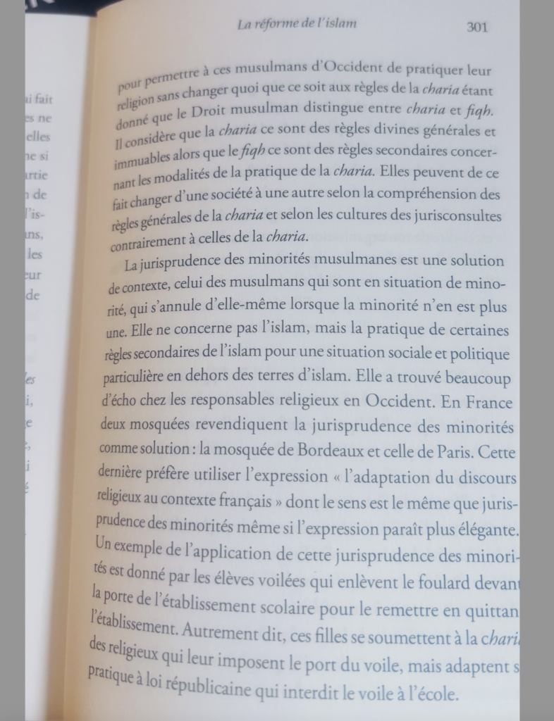 La jurisprudence des minorités musulmanes est une solution de contexte, celui des musulmans qui sont en situation de minorité, qui s’annule d’elle-même lorsque la minorité n’en est plus une. Elle ne concerne pas l’islam, mais la pratique de certaines règles secondaires de l’islam pour une situation sociale et politique particulière en dehors des terres d’islam. Elle a trouvé beaucoup d’écho chez les responsables religieux en Occident. En France deux mosquées revendiquent la jurisprudence des minorités comme solution : la mosquée de Bordeaux et celle de Paris. Cette dernière préfère utiliser l’expression « l’adaptation du discours religieux au contexte français » dont le sens est le même que jurisprudence des minorités même si l’expression paraît plus élégante. Un exemple de l’application de cette jurisprudence des minorités est donné par les élèves voilées qui enlèvent le foulard devant la porte de l’établissement scolaire pour le remettre en quittant l’établissement. Autrement dit, ces filles se soumettent à la charia des religieux qui leur imposent le port du voile, mais adaptent sa pratique à loi républicaine qui interdit le voile à l’école.
