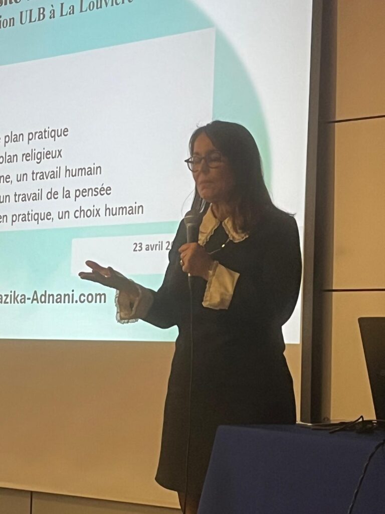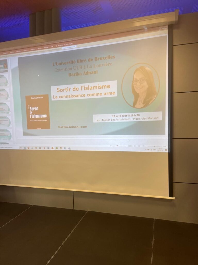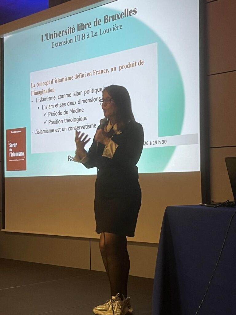 Razika Adnani lors de la conférence qu’elle a donnée le 23 avril 2026 à l’Université libre de Bruxelles – extension à la Louvière – sur son ouvrage Sortir de l’islamisme.