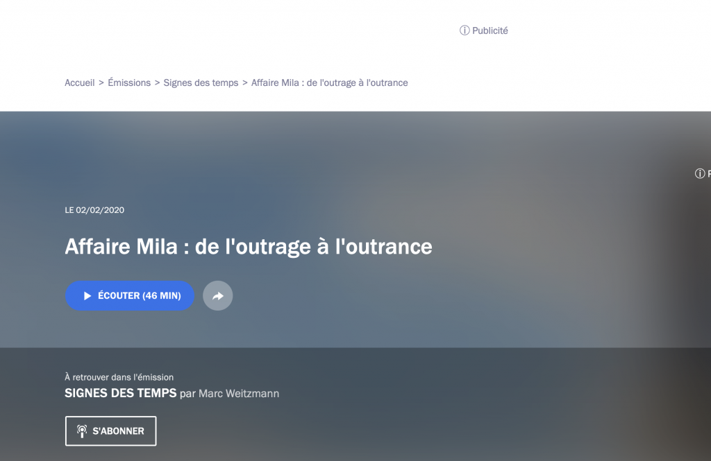 Sur France Culture – Signes des temps : « Mila et cie : de l’outrage à l’outrance » Razika Adnani, Martine Cerf, Richard Malka,Jean-Eric Schoettl et Marc Weitzmann