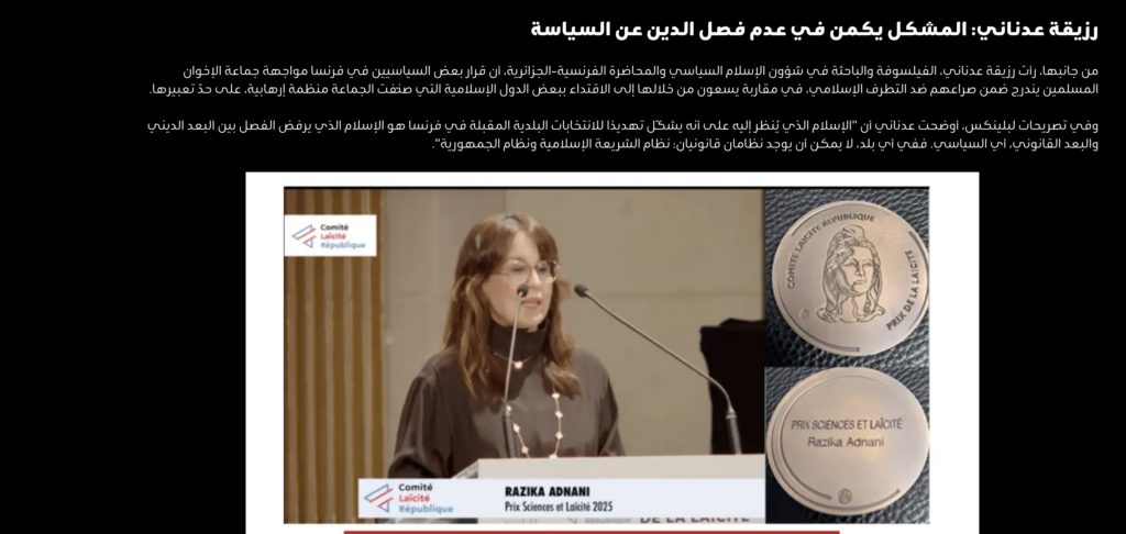 حوار رزيقة عدناني مع Blin.x من جانبها، رأت رزيقة عدناني، الفيلسوفة والباحثة في شؤون الإسلام السياسي والمحاضرة الفرنسية-الجزائرية، أن قرار بعض السياسيين في فرنسا مواجهة جماعة الإخوان المسلمين يندرج ضمن صراعهم ضد التطرف الإسلامي، في مقاربة يسعون من خلالها إلى الاقتداء ببعض الدول الإسلامية التي صنّفت الجماعة منظمة إرهابية، على حدّ تعبيرها. وفي تصريحات لبلينكس، […]